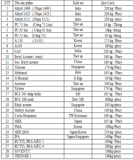 • Dung môi và nhựa các loại: Alkyd resin 3121, alkyd 1486; Toluen, Xylen,Methyl, BCS, Butyl acetate; Ethyl acetate