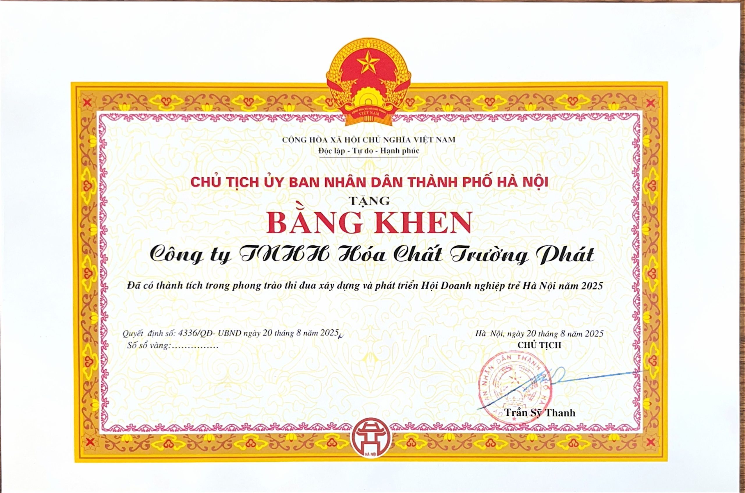 CÔNG TY TNHH HÓA CHẤT TRƯỜNG PHÁT NHẬN BẰNG KHEN CỦA UBND THÀNH PHỐ HÀ NỘI