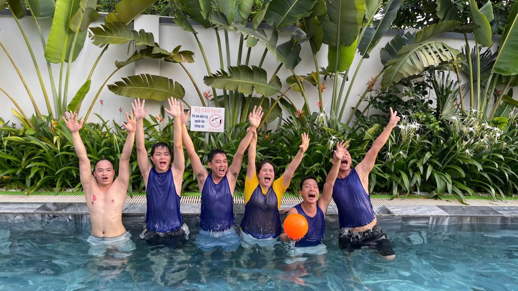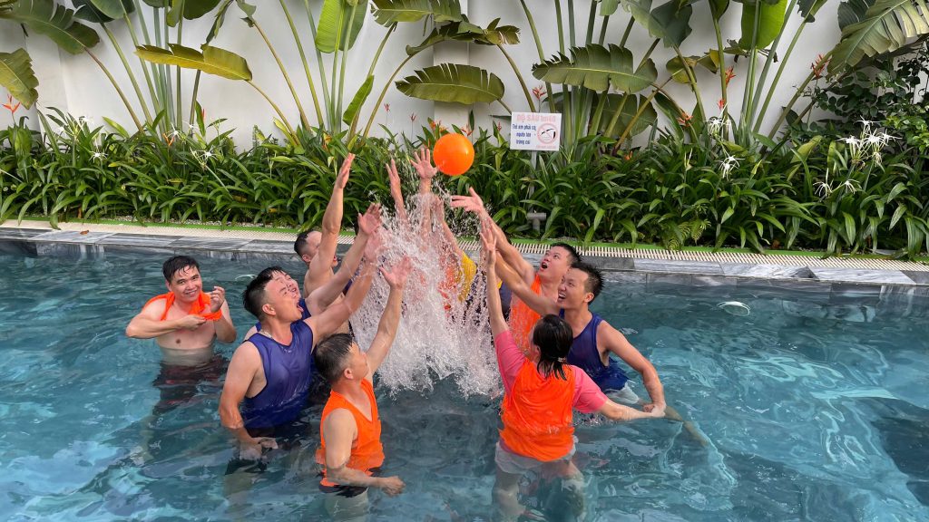 Teambuilding bùng nổ tiếng cười với các trò chơi tập thể như: ném bóng nước, bịt mắt ăn chuối, xúc bột trong thau… khiến không khí trở nên náo nhiệt và gắn kết