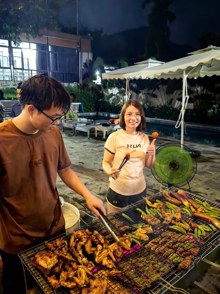 Tiệc tối BBQ bên lửa trại: mọi người cùng nhau nướng thịt, ca hát, chia sẻ tâm tình – tạo nên không gian ấm cúng như một đại gia đình thực thụ.